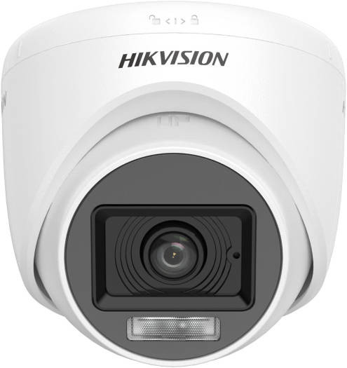 Hikvision 2MP Dual-Light Fixed Turret Camera with built-in microphone, featuring a 2.8 mm fixed lens, up to 20 m infrared illumination, audio transmission over coaxial cable, four switchable signal modes, digital WDR, and a white housing.