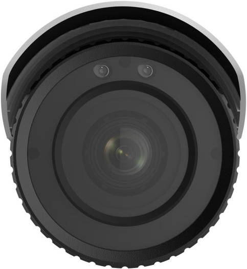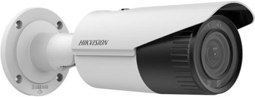 Hikvision 2MP WDR varifocal bullet network camera with a 2.8–12mm motorized lens, H.265+ compression, up to 60m IR range, RJ45 Ethernet, and IP67-rated water and dust resistance (white).