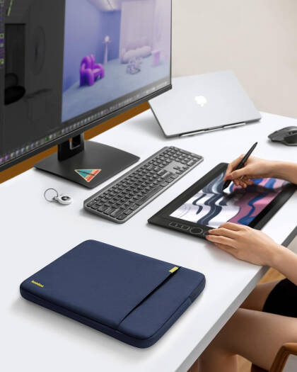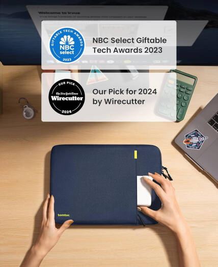 A blue Tomtoc Defender-A13 laptop sleeve designed for 13-inch MacBook or Surface Laptop, featuring 360° protection with CornerArmor, durable recycled fabric, and YKK zippers.