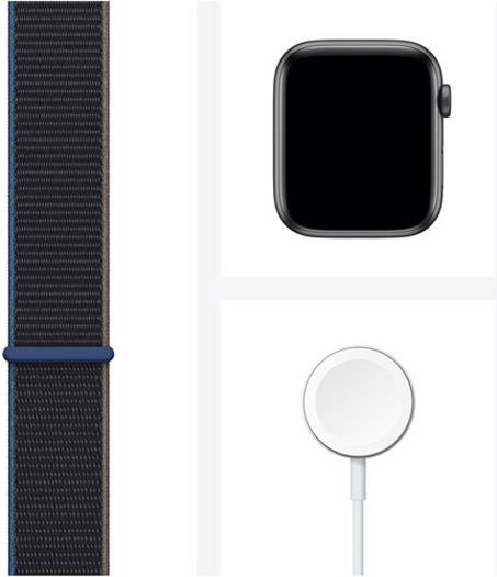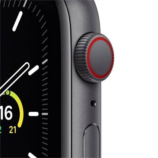 Apple Watch SE (40mm) with a Retina OLED display, GPS + Cellular connectivity, Emergency SOS, space gray aluminum case, and charcoal sport loop.