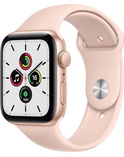 Apple Watch SE with GPS, 44mm gold aluminum case, paired with a gold sport band