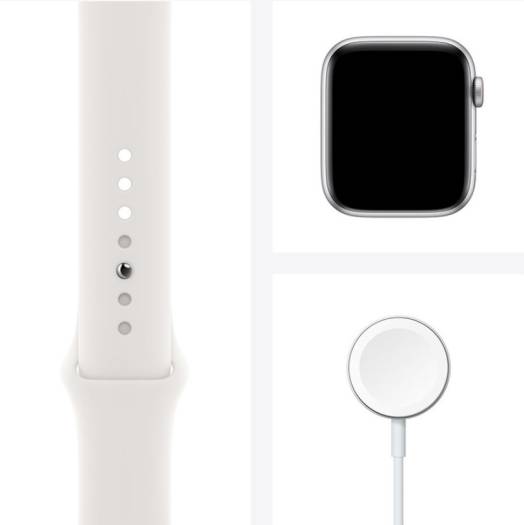 Apple Watch SE with GPS + Cellular, 40mm silver aluminum case, paired with a silver sport band