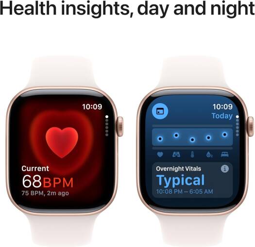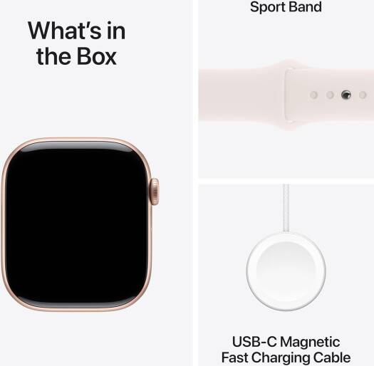 Apple Watch Series 10 (GPS, 42mm) with a rose-gold aluminum case, light blush sport band (S/M), always-on Retina display, water-resistant design, TRA version.