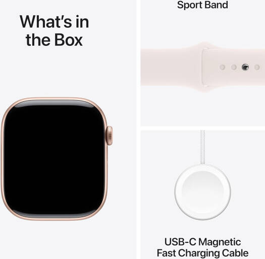 Apple Watch Series 10 with an always-on Retina display, S10 SiP dual-core processor, 4-core neural engine, watchOS 11, GPS + Cellular, a 42mm rose-gold aluminum case, and an S/M light blush sport band.
