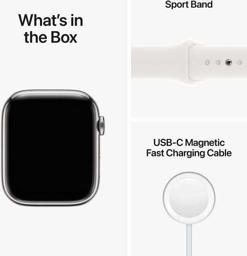 Apple Watch Series 8 with GPS, 41mm silver aluminum case, paired with a white sport band (Regular)