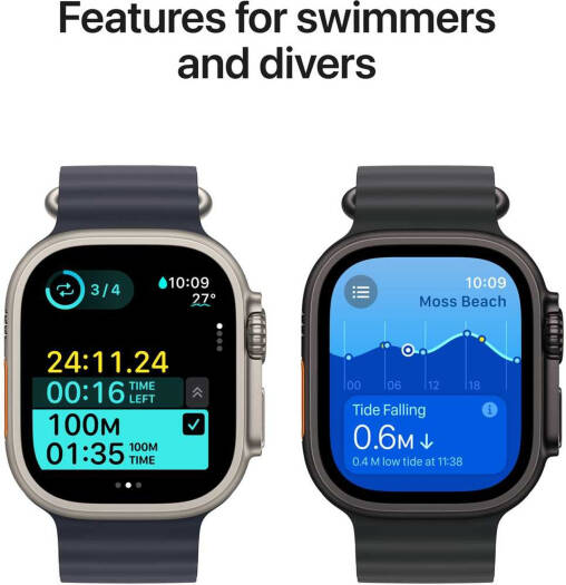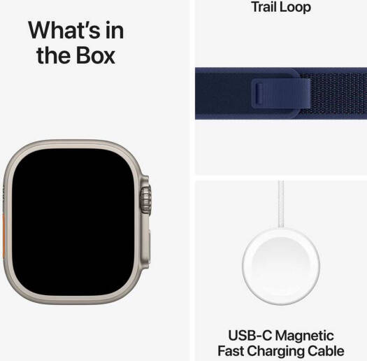 Apple Watch Ultra 2 featuring an always-on Retina display, S9 SiP dual-core chip with a 4-core neural engine, watchOS 11, GPS + Cellular, a 49mm natural titanium case, and an M/L blue Trail Loop band.