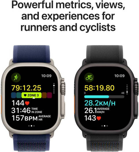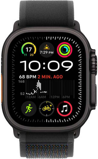 Apple Watch Ultra 2 with an always-on Retina display, S9 SiP dual-core processor and 4-core neural engine, running watchOS 11. Features GPS + Cellular, a 49mm black titanium case, and an M/L black Trail Loop band.