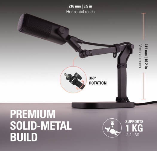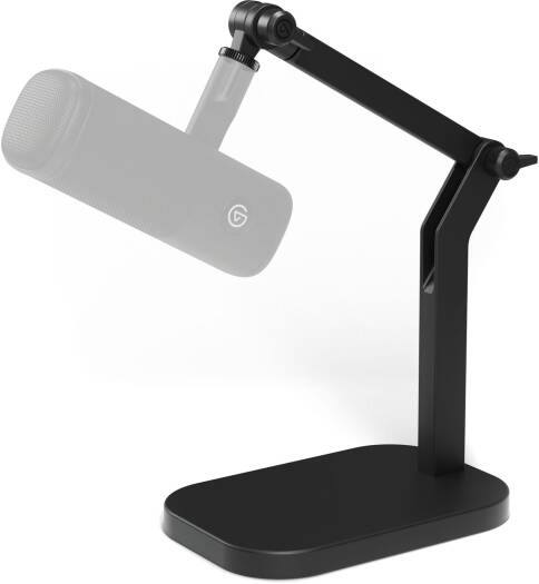Elgato Wave Desk Stand – studio mounting arm with 360° rotation and up to 180° tilt, supports microphones or accessories up to 2.2 lbs, features a compact, low-profile design compared to full-sized boom arms, in black.