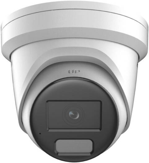 Hikvision 4MP Smart Hybrid Light ColorVu Fixed Turret Network Camera with a 1/1.8" progressive scan CMOS sensor, fixed focal lens, F1.0 aperture, and white light illumination, in white.