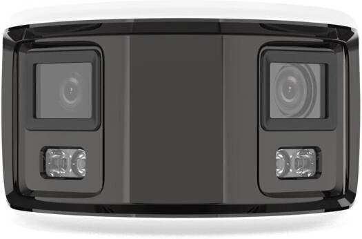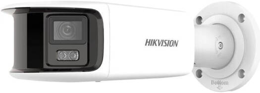 Hikvision 8MP Panoramic ColorVu Fixed Bullet Network Camera featuring dual 1/1.8" progressive scan CMOS sensors, 4mm fixed lens, and F1.0 aperture, in white.
