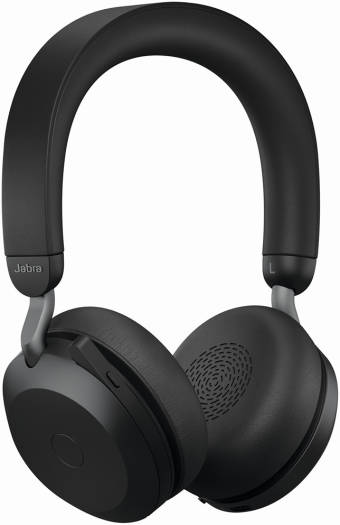 Jabra Evolve2 75 Link 380c UC Noise-Canceling Wireless Headset featuring 40 mm drivers, 8 integrated microphones, dual-foam ear cushions, busy light indicator, ANC technology, charging stand, and a black finish.