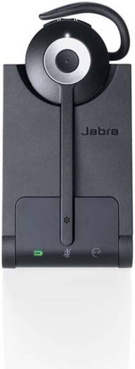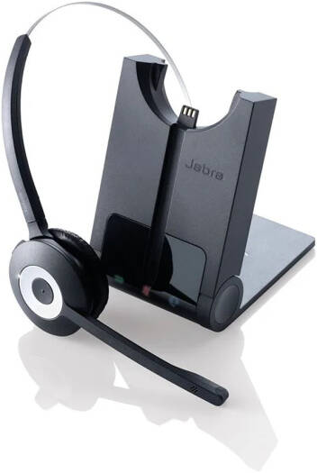 Jabra Pro 920 Single-Ear Wireless Headset (EMEA) with support for pairing up to four headsets to one base, a noise-canceling microphone, up to 8 hours of talk time, a built-in rechargeable battery, and a sleek black design.