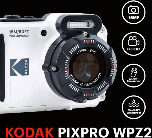 Kodak PIXPRO WPZ2 digital camera in white, featuring a 16MP CMOS sensor, 4× optical zoom, 2.7-inch LCD, RAW file support, waterproof and rugged design, and Full HD 1080p video recording.