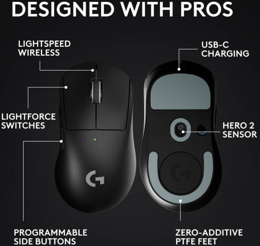 Logitech G PRO X Superlight 2 DEX Gaming Mouse – lightweight wireless design, HERO 2 optical sensor with up to 44,000 DPI, 5 programmable buttons, in black.