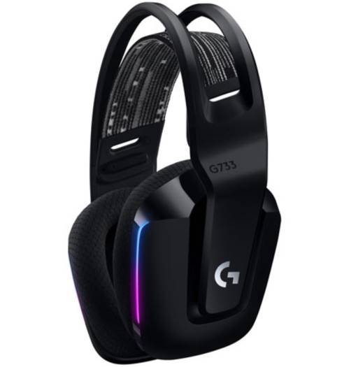 Logitech G733 LIGHTSPEED Wireless RGB Gaming Headset in Black, featuring PRO-G 40mm drivers, a 6mm cardioid microphone, DTS Headphone:X 2.0 surround sound, and 16.8 million customizable lighting colors.