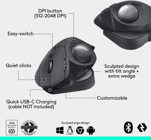 Logitech MX Ergo S Plus Wireless Trackball Mouse – features a 2048 DPI laser sensor, 20° adjustable hinge, 6 programmable buttons, 4-way scrolling, dual 2.4 GHz and Bluetooth connectivity, 500 mAh rechargeable battery