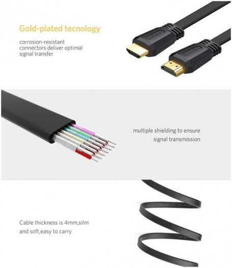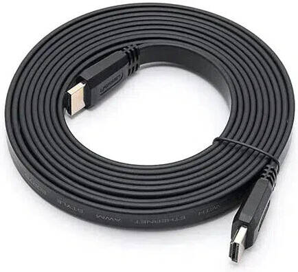 UGREEN ED015 Flat HDMI Cable, 2 meters, HDMI 2.0, supports up to 4K@60Hz. Constructed with 30AWG tin-plated oxygen-free copper and gold-plated connectors. Compatible with PC, laptop, and TV. Color: Black.