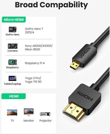 UGREEN HD127 2M Micro HDMI to HDMI Adapter Cable, Male-to-Male, High-Speed, Supports 4K@60Hz, 3D, 1080P Audio Return, Gold-Plated Connectors, Black.