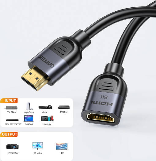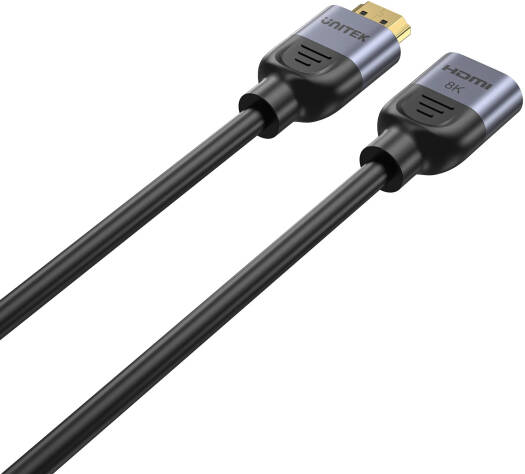 Unitek Ultra Stream 8K HDMI Extension Cable supporting 8K at 60Hz, with 48Gbps data transfer, plug-and-play functionality, gold-plated connectors, aluminum alloy and PVC housing, 2-meter length, in black.